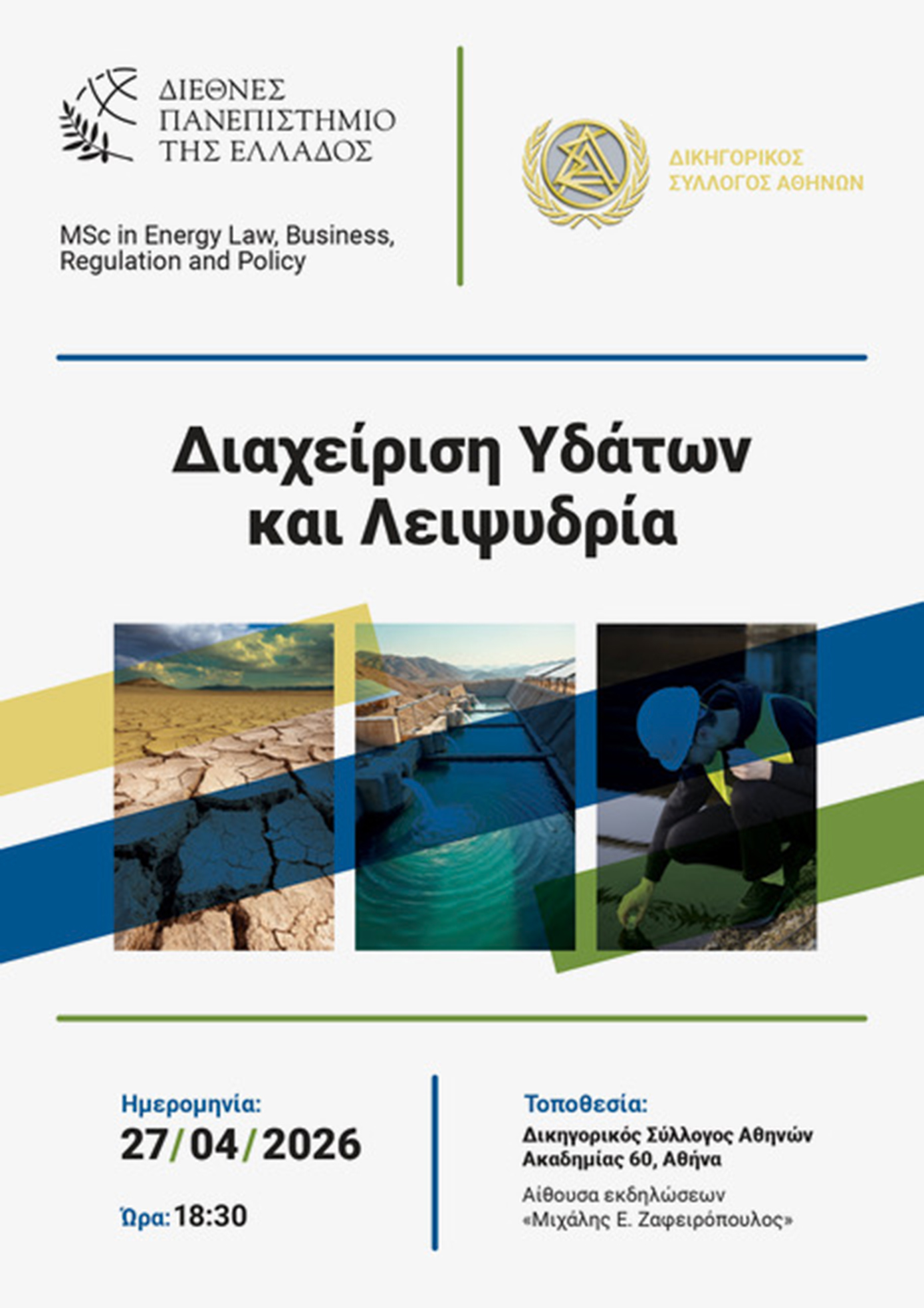 Το «Δικηγορικός Σύλλογος Αθηνών» και το Διεθνές Πανεπιστήμιο Ελλάδος συνδιοργανώνουν επιστημονική εκδήλωση με τίτλο «Διαχείριση υδάτων και λειψυδρία». Η εκδήλωση θα πραγματοποιηθεί τη Δευτέρα 27 Απριλίου 2026 και ώρα 18:30 στις εγκαταστάσεις του Δικηγορικού Συλλόγου Αθηνών, με εισηγητές διακεκριμένους πανεπιστημιακούς του κλάδου.