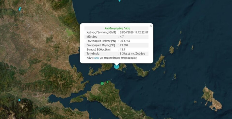 Το Γεωδυναμικό Ινστιτούτο του Εθνικού Αστεροσκοπείου Αθηνών, εκ μέρους των τεσσάρων φορέων συγκρότησης του Ενιαίου Εθνικού Σεισμολογικού Δικτύου, ανακοίνωσε σεισμική δόνηση 4,7 βαθμών Ρίχτερ κοντά στην Σκιάθο.