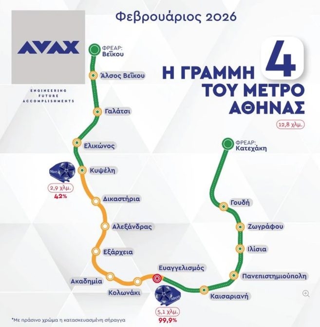 Την ίδια ώρα, το βλέμμα στρέφεται στον δεύτερο μετροπόντικα, τη «Νίκη», που κινείται αντίστροφα από το άλσος Βεΐκου. Η «Νίκη» έχει ήδη διανοίξει σήραγγα 2.960 μέτρων, καλύπτοντας το 42% της συνολικής διαδρομής των 7,5 χιλιομέτρων, και συνεχίζει από την πλατεία Κυψέλης προς τα Δικαστήρια και τα Εξάρχεια, με τελικό σταθμό και πάλι τον Ευαγγελισμό.