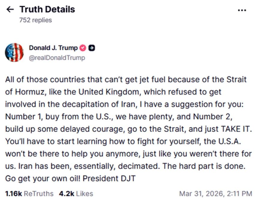 Κάλεσε τους συμμάχους να δείξουν «καθυστερημένο θάρρος» και να κατευθυνθούν οι ίδιοι στα Στενά του Ορμούζ ώστε να «πάρουν το πετρέλαιο». «Πρέπει να μάθετε να πολεμάτε μόνοι σας. Οι ΗΠΑ δεν θα είναι πλέον εκεί για να σας βοηθήσουν, όπως ακριβώς δεν ήσασταν εκεί για εμάς», πρόσθεσε.