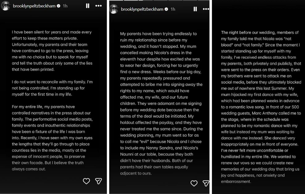 Με τη σχετική του δήλωση, στράφηκε κατά των γονιών του, Ντέιβιντ και Βικτόρια Μπέκαμ, υποστηρίζοντας ότι χειραγωγούσαν συστηματικά τον Τύπο και επιχείρησαν να «καταστρέψουν» τη σχέση του με τη σύζυγό του, Νίκολα.