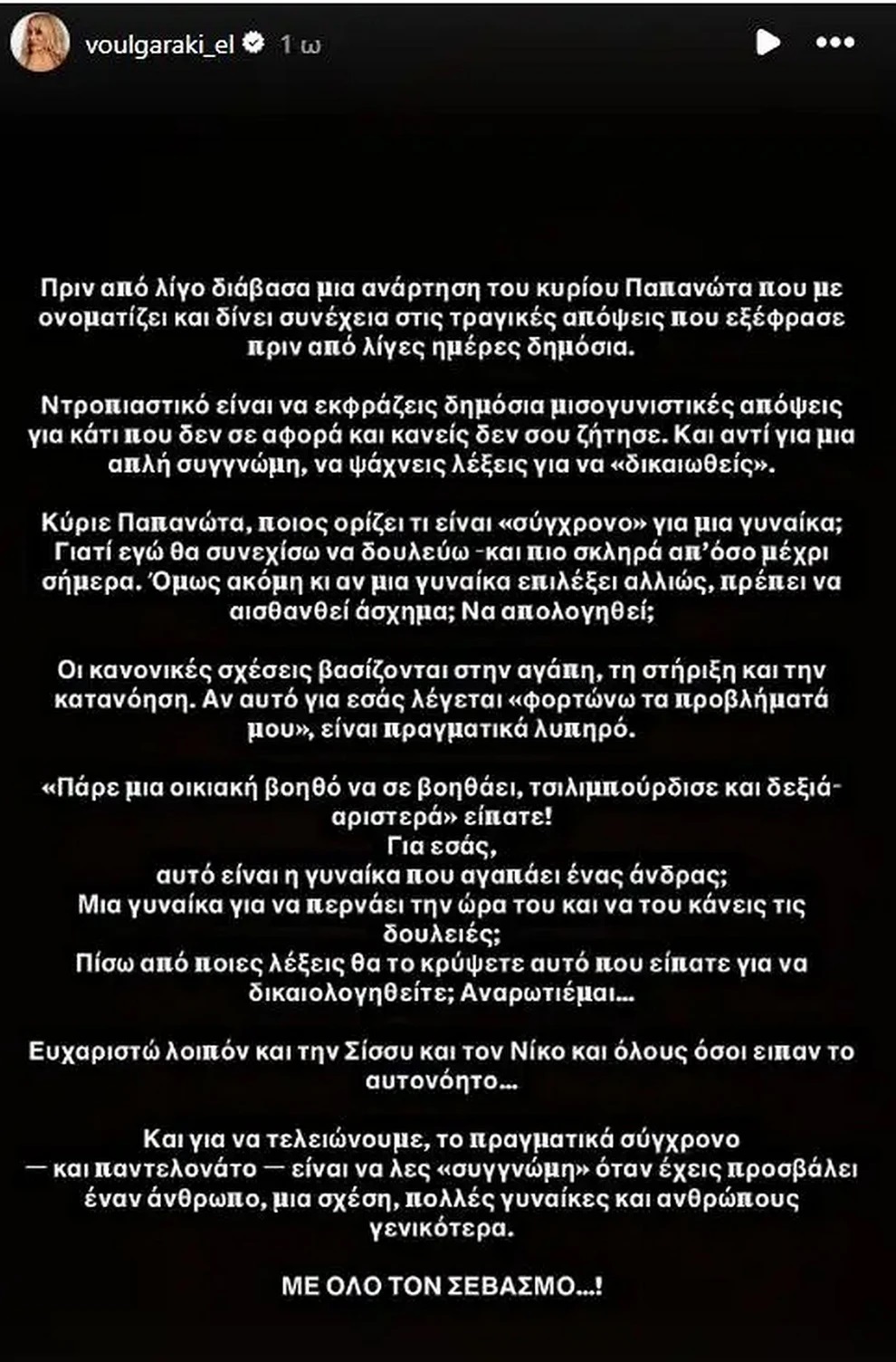 «Και για να τελειώνουμε, το πραγματικά σύγχρονο – και παντελονάτο – είναι να λες “συγνώμη” όταν έχεις προσβάλλει έναν άνθρωπο, μια σχέση, πολλές γυναίκες και ανθρώπους γενικότερα. Με όλο τον σεβασμό» ολοκληρώνει η Ελένη Βουλγαράκη την έντονη, διαδικτυακή, head-on επίθεση στον Δημήτρη Παπανώτα.