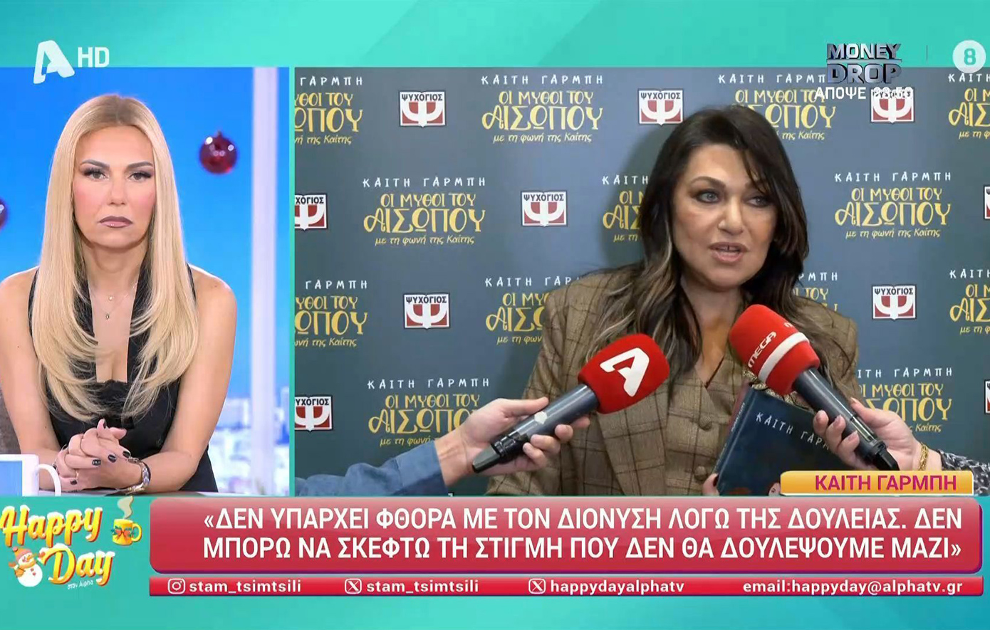«17 χρόνια ονειρευόμουν να βγει ένα βιβλίο με τη φωνή μου, από τότε που ο Δημήτρης ήταν πολύ μικρός και του διαβάζαμε παραμύθια. Οι “Μύθοι του Αισώπου” ήταν η αδυναμία του», λέει η Καίτη Γαρμπή, προσθέτοντας πως δεν έχει σκεφτεί να γράψει τη δική της βιογραφία.