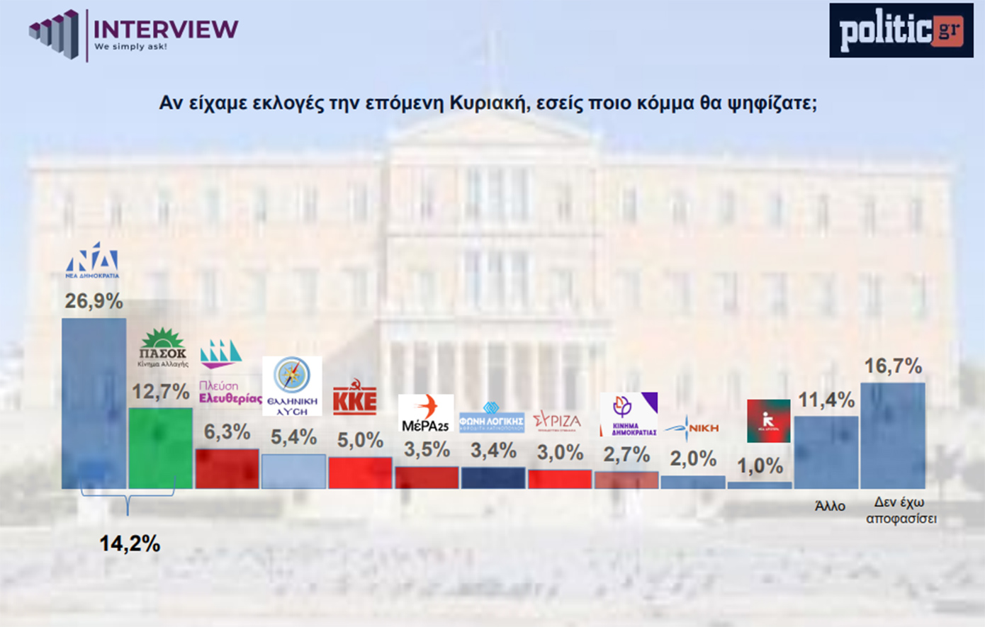 Κατά την ερώτηση ποιο κόμμα θα επιλέγατε την Κυριακή αν είχαμε κάλπες, τα ποσοστά διαμορφώνονται έτσι: 26,9% η Νέα Δημοκρατία, 12,7% το ΠΑΣΟΚ, η Πλεύση Ελευθερίας με 6,3%, η Ελληνική Λύση με 5,4%, το ΚΚΕ με 5,0%, το ΜέΡΑ25 με 3,5%, η Φωνή Λογικής με 3,4%, ο ΣΥΡΙΖΑ με 3,0%, το Κίνημα Δημοκρατίας με 2,7%, η ΝΙΚΗ με 2,0%, η Νέα Αριστερά με 1%.