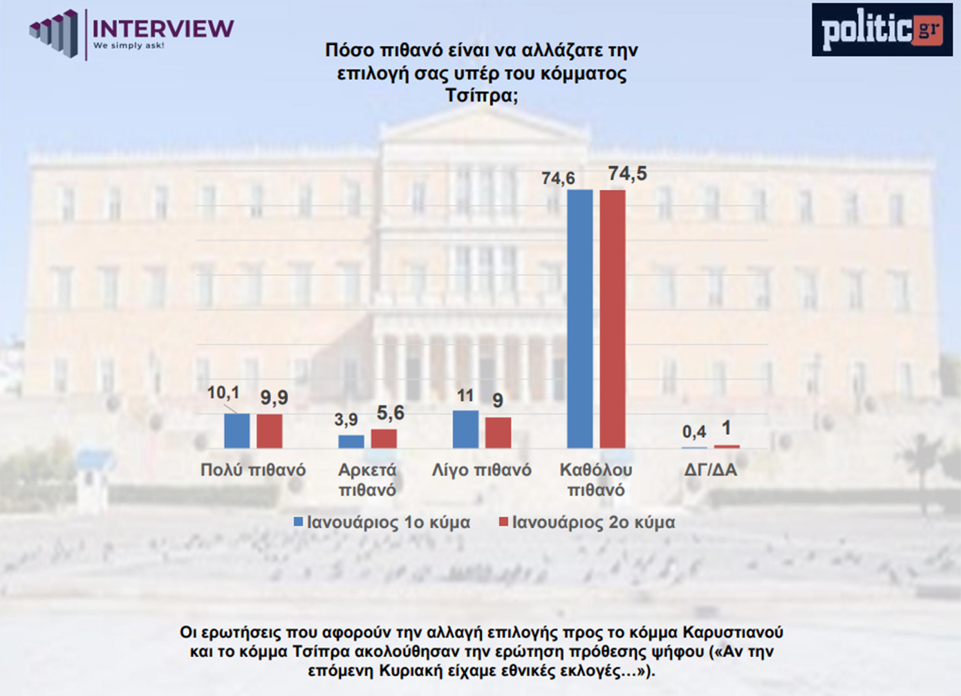 Η ίδια εικόνα εντοπίζεται στη δυνητική ψήφο: στο δεύτερο κύμα το 74,5% δηλώνει «καθόλου πιθανό» να μετακινηθεί υπέρ ενός κόμματος Τσίπρα, ενώ μόλις 9,9% εκτιμά «πολύ πιθανό». Συνολικά το 24,5% δηλώνει λίγο, αρκετά ή πολύ πιθανό να αλλάξει την επιλογή του προς ένα κόμμα Τσίπρα.