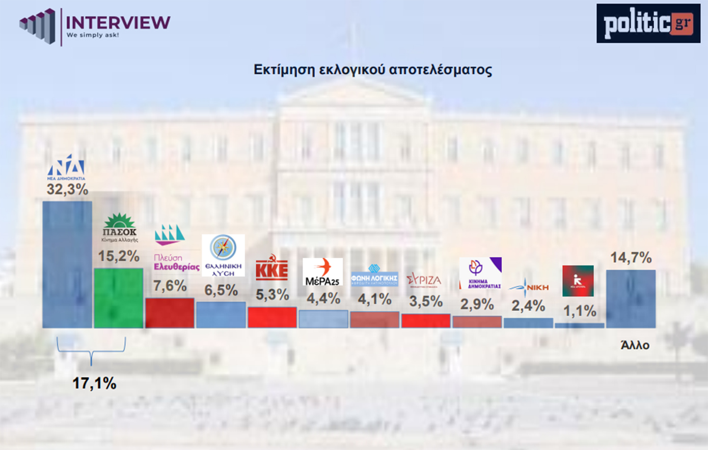 Στην πρόβλεψη εκλογικής επιρροής η ΝΔ προηγείται με 32,3% και ακολουθεί σε απόσταση 17 μονάδων το ΠΑΣΟΚ με 15,2%. Τρίτη εμφανίζεται η Πλεύση Ελευθερίας με 7,6%, μετά η Ελληνική Λύση με 6,5%, το ΚΚΕ με 5,3%, το ΜεΡΑ25 4,4%, η Φωνή Λογικής με 4,1%, ο ΣΥΡΙΖΑ με 3,5%, το Κίνημα Δημοκρατίας με 2,9%, η Νίκη με 2,4% και η Νέα Αριστερά με 1,1%.