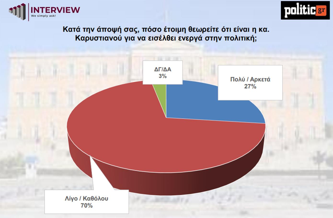 Ερωτώμενοι για το πόσο έτοιμη είναι η Μαρία Καρυστιανού να ενεργοποιηθεί στην πολιτική, οι περισσότεροι εμφανίζονται επιφυλακτικοί: το 70% απαντά «λίγο ή καθόλου έτοιμη», το 27% «πολύ ή αρκετά έτοιμη» και μόλις το 3% δηλώνει «δεν γνωρίζω/δεν απαντώ».