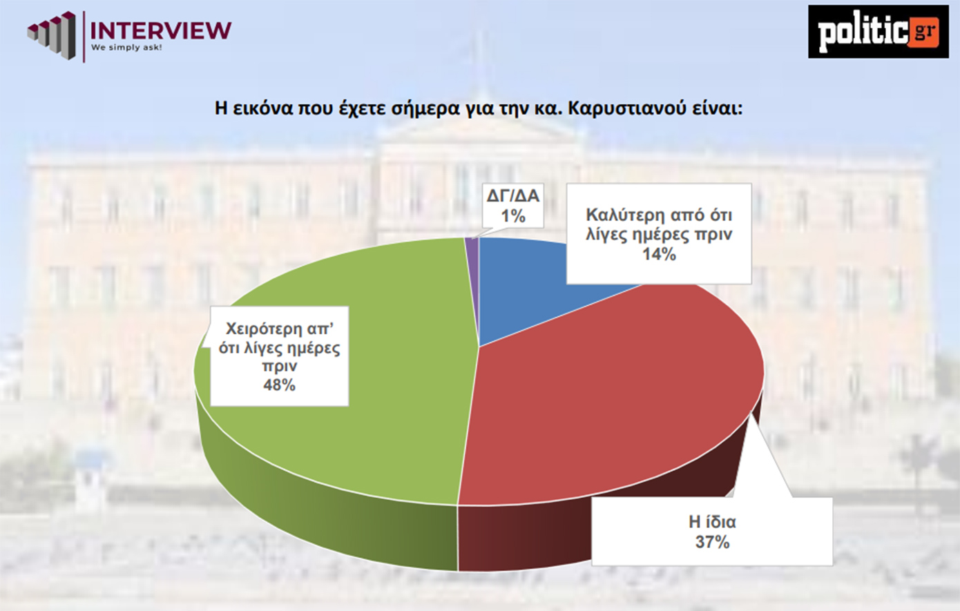 Συγκεκριμένα, το 48% λέει ότι η εικόνα της είναι χειρότερη σε σύγκριση με λίγες μέρες πριν, το 37% ότι μένει ίδια, ενώ το 14% ότι είναι καλύτερη. Αντιθέτως, η δυνητική ψήφος παραμένει σταθερή.