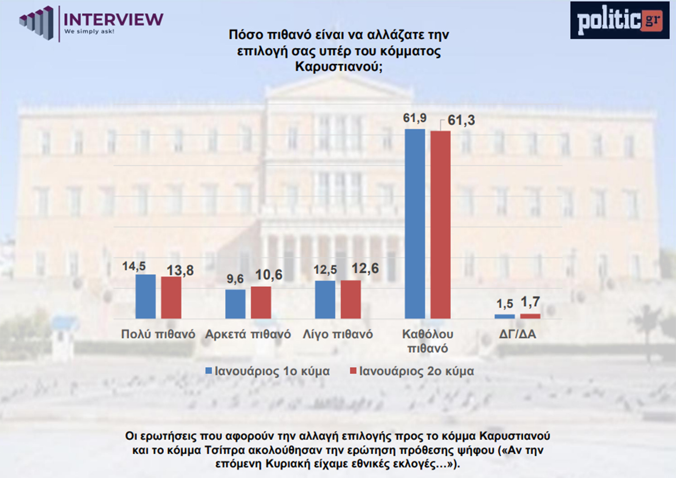 Το 14,5% απαντά «πολύ πιθανό» να μετακινηθεί υπέρ ενός κόμματος Καρυστιανού στο πρώτο κύμα (πριν τη συνέντευξη) και 13,8% στο δεύτερο. Συνολικά το 37% θεωρεί πιθανή μια τέτοια μετακίνηση.