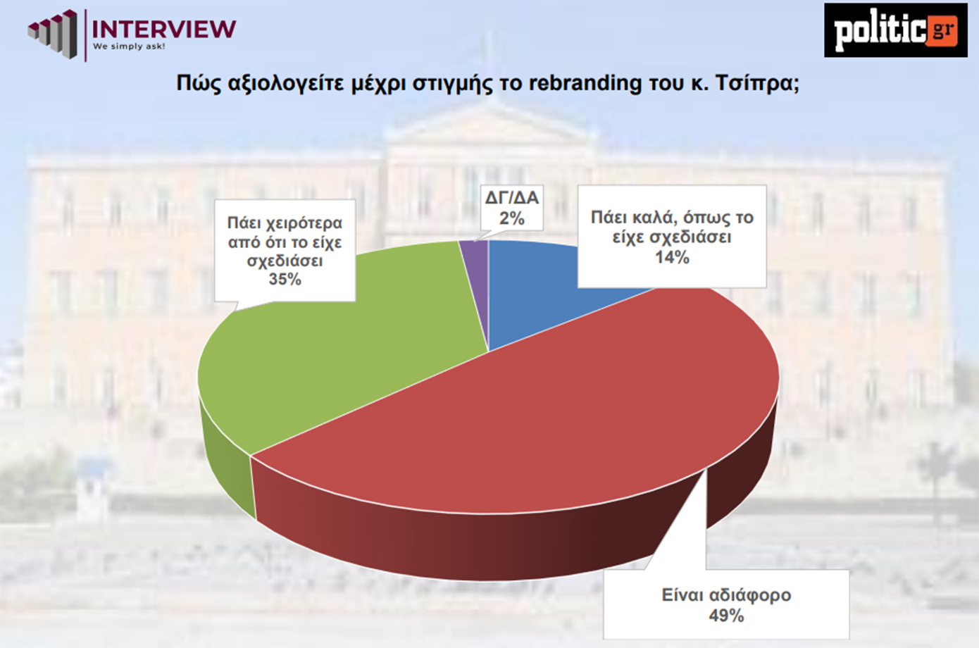 Τα ευρήματα δείχνουν πως το rebranding του Αλέξη Τσίπρα δεν έχει αφήσει ισχυρό αποτύπωμα. Σχεδόν οι μισοί (49%) το χαρακτηρίζουν αδιάφορο, 35% το κρίνουν χειρότερο από το σχεδιασμό και μόλις 14% το θεωρούν «πάει καλά».