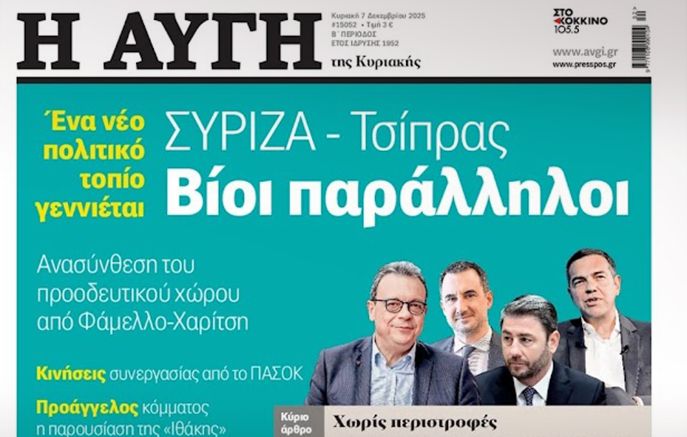 Στην κυριακάτικη «Αυγή», στο κύριο άρθρο αναφέρεται: «Η πολιτική σκηνή μεταμορφώνεται και κανείς δεν μπορεί να πράξει κάτι που δεν βλέπει ή να αποφύγει τις αλλαγές της εποχής. Ο Αλέξης Τσίπρας επέλεξε σαφώς τη δική του μονοπάτι, χωρίς να συμφωνεί με άλλους».